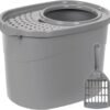 This product is an enclosed metal litter box with a fitted lid and high sides for indoor cats. The pan is made from stainless steel with a smooth surface that does not retain residue easily and supports routine cleaning. The enclosed design helps contain litter within the box, and the high side walls reduce spill outside the pan during use. A buckle-style lid attachment helps keep the cover in place during normal movement. The entrance includes a litter tracking pedal to collect loose litter from paws. An included scoop supports daily maintenance. This litter box is suitable for placement in dry, level indoor areas and can be cleaned by rinsing with water or wiping with a damp cloth.